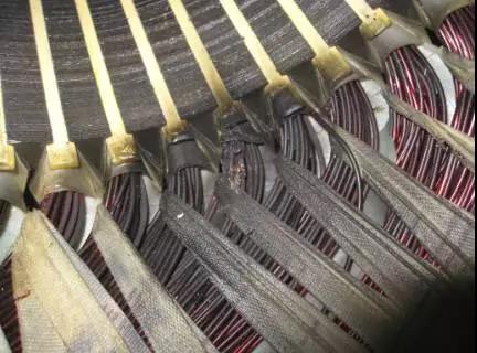 特征:繞組全部變黑色,端部扎帶變色并且變脆甚至斷裂。