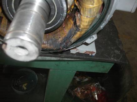 特征:繞組全部變黑色,端部扎帶變色并且變脆甚至斷裂。